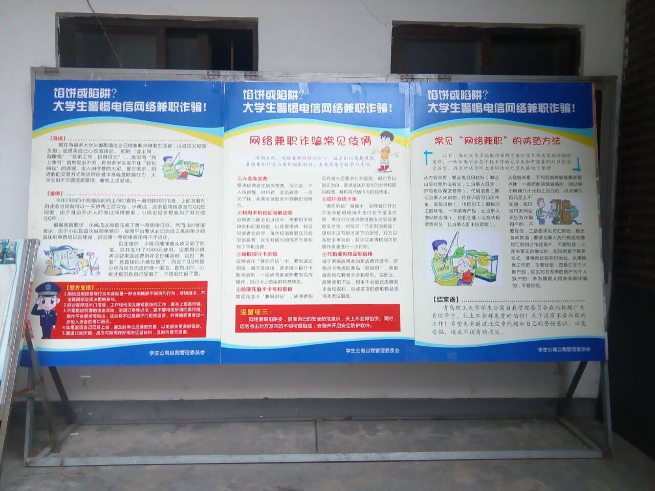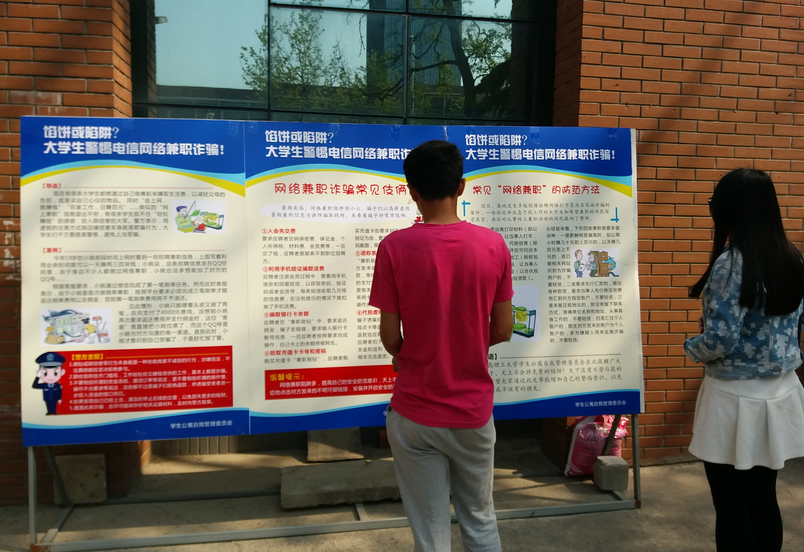 近期,学生处公寓中心结合在全国频发的大学生电信诈骗案件,为提高同学们的网络安全意识,学生公寓自我管理委员会开展了防电信诈骗宣传教育工作,并在宿舍楼下安放了宣传展板。展板以现实生活中的真实案件为例,向同学们揭露了骗子的惯用伎俩,以及警方向同学们提的建议。