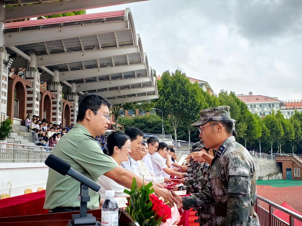 比学赶超练精兵,强我理工展风采。党委常委、组织部部长郭建锋现场为承训部队赠送锦旗,表达了学校对承训部队的衷心感谢。团委书记苏伟、临沂校区团委副书记王彤宣读2023级新生军训工作先进集体和个人表彰决定。学校领导依次为受表彰的先进集体和先进个人颁奖。