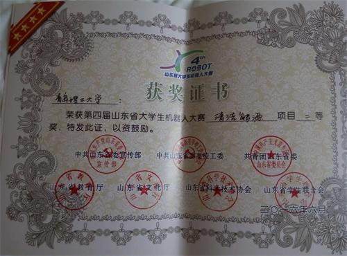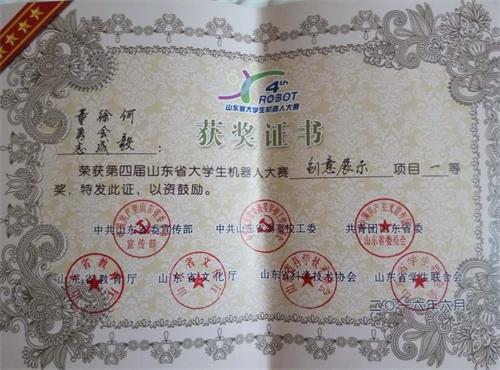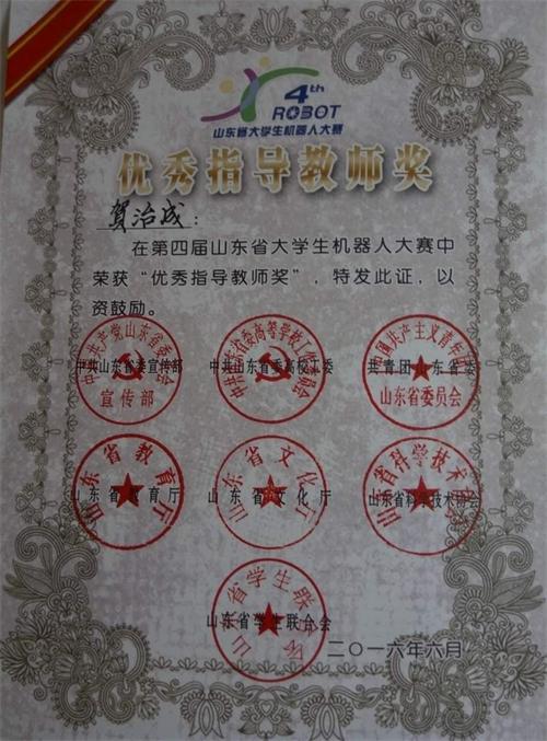 6月4日至5日,由山东省委宣传部、省委高校工委、团省委、省教育厅、省文化厅、省科协、省学联主办,共青团济宁市委、邹城市人民政府承办的第四届山东省 大学生机器人大赛在济宁举行。yl7703永利集团首次组队参加该项赛事,两个项目分获一等奖、二等奖。贺治成获优秀指导教师奖。