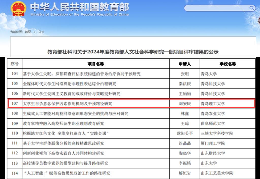 近日,教育部社会科学司公示了2024年度教育部人文社会科学研究专项任务项目(高校辅导员研究)的评审结果,我校学生工作处刘安庆主持申报的《大学生自杀意念保护因素作用机制及干预路径研究》获批立项。