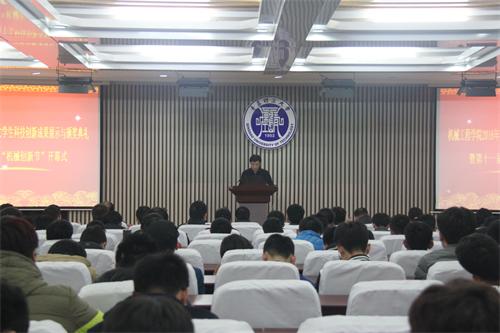 接着,机械学院院长谭继文致辞,他回顾了学院近年来科技创新的历程、取得的优异成绩。他表示学院将大学生创新创业活动作为教育教学的重要组成部分,积极克服各方面条件的限制,全力助推大学生创新创业,经过几年的努力和实践探索,建立了较完备的“创新创业人才培养政策制度驱动、创新创业赛事驱动、校内加工中心实验室驱动、校外企业实习驱动、科技项目转化驱动”的“五维驱动机制”,积极引导青年学生参加创新创业活动;学院大学生科技成果的取得,离不开学校领导的关心和各部门的大力支持。机械学院党总支副书记李国涛宣读了《机械学院2016年度大学生科技创新获奖名单》。