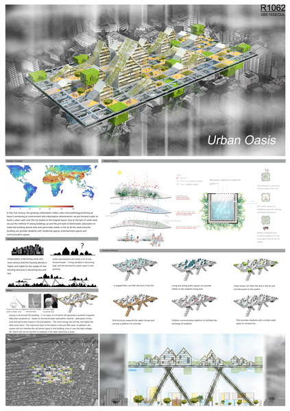 学生的参赛作品《城市绿洲 》针对韩国首尔日益恶化的空气环境与城市化现象,提出了在原有城市布局的基础上,在城市上空打造一个城市绿洲的方案。由于城市用地紧张,所以采用将建筑抬高的方法,利用电生磁的原理,在原有筑的上空建造一个可以吸收空气中细尘和可吸入颗粒物的建筑,可以为居民提供居住、娱乐和交流的绿色空间,实现建筑的可持续性发展。将整个建筑建设在城市的不同地点就可以大范围的降低城市细尘和可吸入颗粒物密度,进而净化空气。
