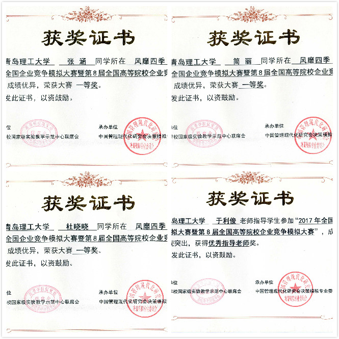 2017年4月28日,由高等学校国家级实验教学示范中心联席会和中国管理现代化研究会决策模拟专业委员会主办的全国企业竞争模拟大赛总决赛在烟台大学落下帷幕,我校管理学院张涵、简丽和杜晓晓同学组成的yl7703永利集团“风靡四季”团队在指导老师于利俊的带领下喜获全国一等奖,我校荣获“优秀组织奖”,于利俊被评为“优秀指导老师”。