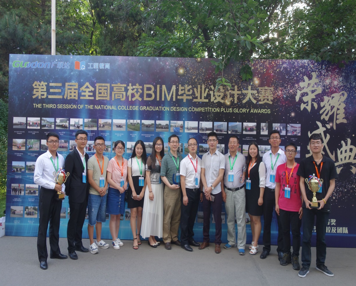 管理学院领导高度重视,精心组织,依托国际工程项目管理、工程造价、工程管理省级品牌、特色专业,从师资、资金、技术等方面提供全方位服务与支持。从2016年10月至2017年6月历时近9个月,参赛同学和指导老师付出了巨大努力。在专业教师的精心指导、学生的热情参与、团队成员团结协作和精心准备下,管理学院国际工程项目管理专业两支队伍“砼一个梦想”和“筑梦青理”(两支队伍指导教师均为姜吉坤、曹卫群)在提交的作品和现场答辩环节获得了评委组的高度认可,分别荣获国家特等奖,并获得广联达软件应用技能认证证书。
