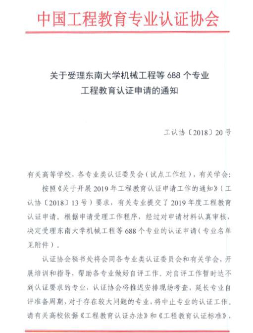 近日,教育部高等教育教学评估中心、中国工程教育专业认证协会发布《关于受理东南大学机械工程等688个专业工程教育认证申请的通知》,我校机械设计制造及其自动化、车辆工程、环境工程、安全工程等四个专业成功获批受理,受理专业(首次认证)数与青岛科技大学、济南大学同居全省省属高校之首,实现了该项工作的“零”的突破。