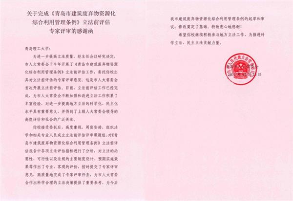 多年来,我校依据跨学科的优势,积极参与青岛市人大工作理论研究,取得可喜成果,研究工作和成果被全国人大、国务院法制办和山东省人大网站报道,青岛市人大常委会也向学校发来感谢信。