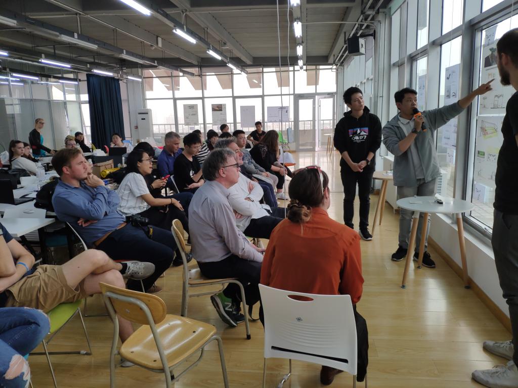 在结题答辩会上,各个设计团队各展风采,用严谨的逻辑和生动的语言讲述了各自对“绿色公交站点”的设计构思。有的提取中德生态园建筑立面上的“X”元素,将建筑平面进行分割推拉和旋转,并且引入秋千和站顶绿植元素以形成有趣的车站空间;有的则将中国扇子的折叠元素融入到墙体的设计中,用绳梯增强趣味,使公交站点成为活泼的场所……虽然英语都不是大家的母语,答辩现场还是掌声、欢笑声不绝;每组设计都达到了指导老师提出的要求: 用建筑的语言,把人们的注意力从手机解放出来。