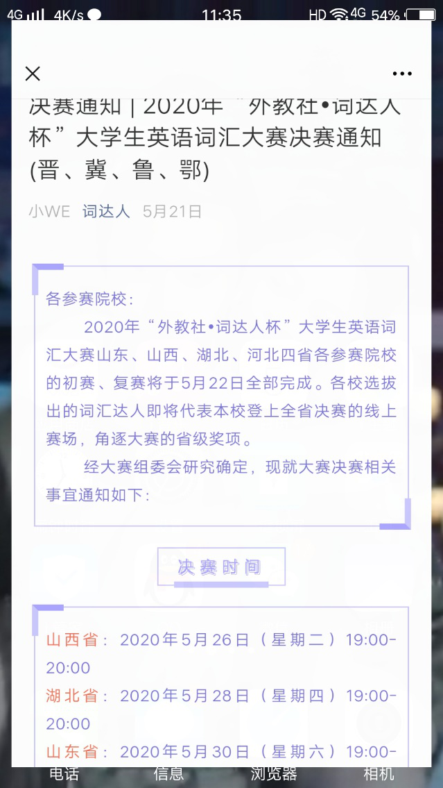 “外教社•词达人杯”大学生英语词汇大赛是上海外语教育出版社为更好地满足高校大学英语线上教学需求,联合山东省本科教育大学外语教学指导委员会联合主办的公益性在线词汇竞赛活动。比赛依托外教社“词达人英语词汇智慧学习平台”微信公众号,面向省内高校非英语专业学生,以大学英语四、六级考试词汇为竞赛内容,通过在线测试方式完成竞赛。自4月启动以来,“词达人”词汇大赛吸引了全省本科、独立学院和高职在内的65所高校共16万多名学生报名参加,参赛院校数量和人数规模均远超同类竞赛。本校学生对本次比赛也表现出了极大的热情,初赛报名人数达到了6453人。经过精心地前期策划和安排,在“词达人”平台的协助下,我校分别于5月8日和5月16日成功地举行了校内初赛和复赛的选拔工作,最终选出成绩前20名同学参加山东省决赛。