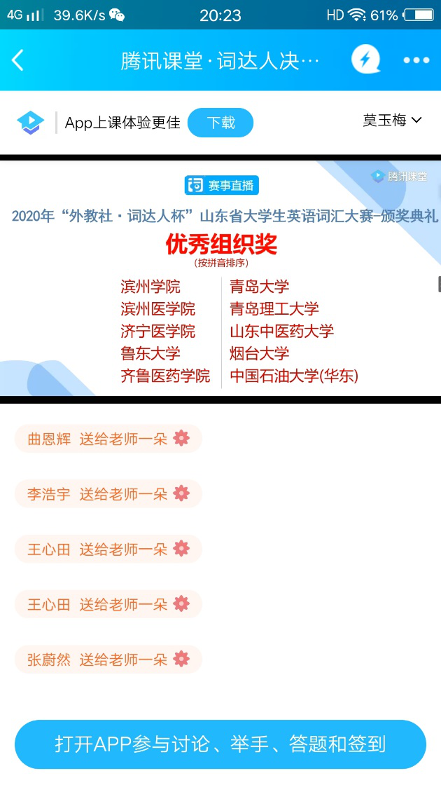 2020年“外教社•词达人杯”大学英语词汇大赛山东省决赛于5月30日19点举行,共有来自65所高校的1218位非英语专业学生参赛。我校经过校内初赛和复赛选出的20位学生参与决赛,同其他参赛选手齐聚“词达人”平台云端赛场,同台竞技。