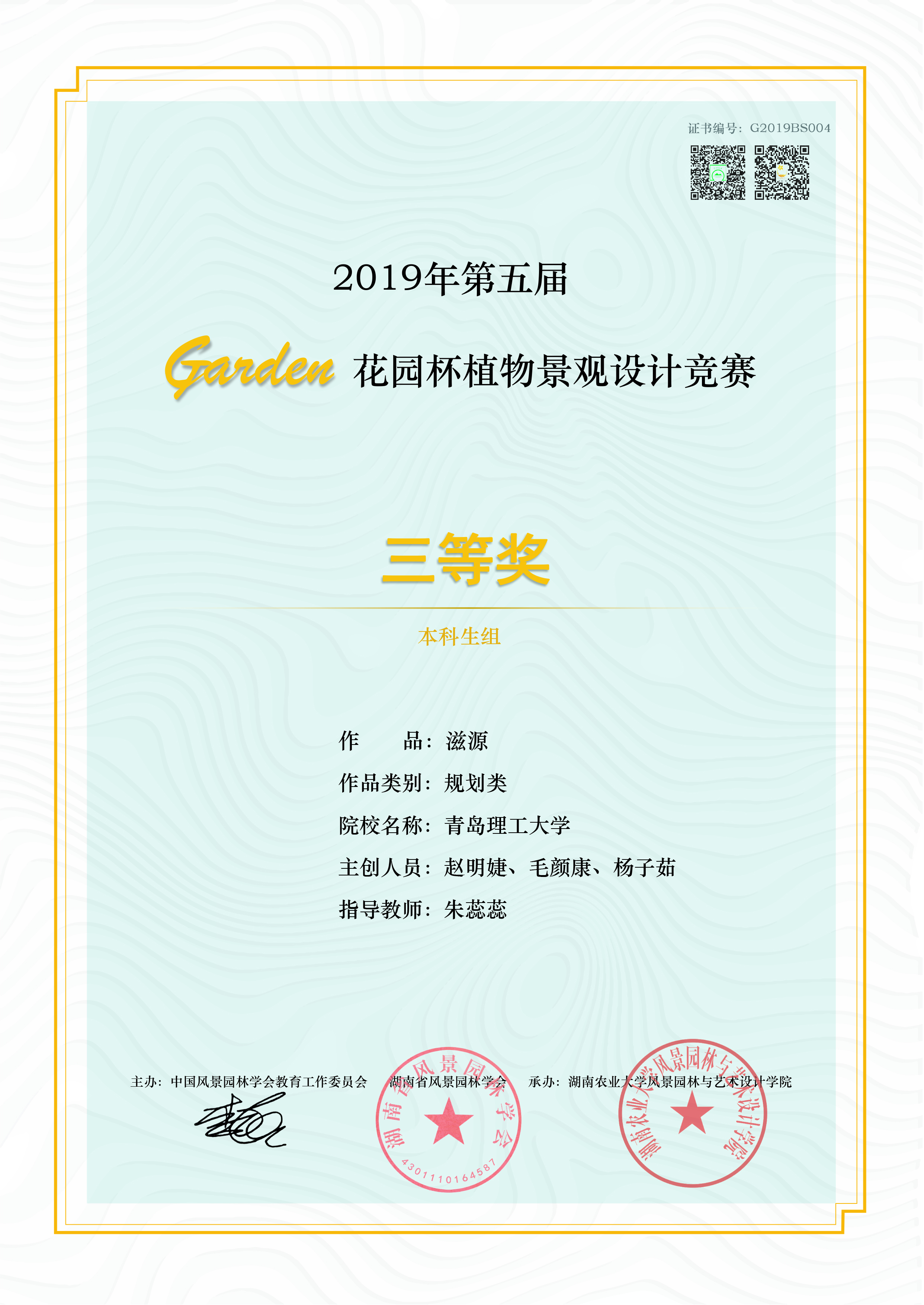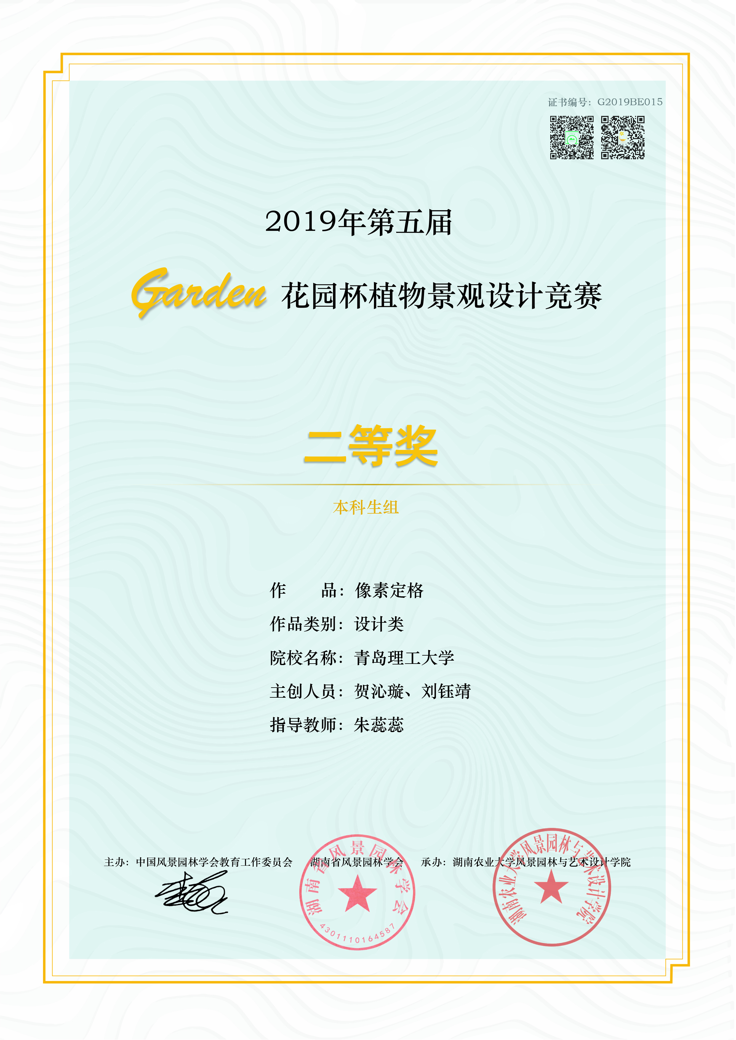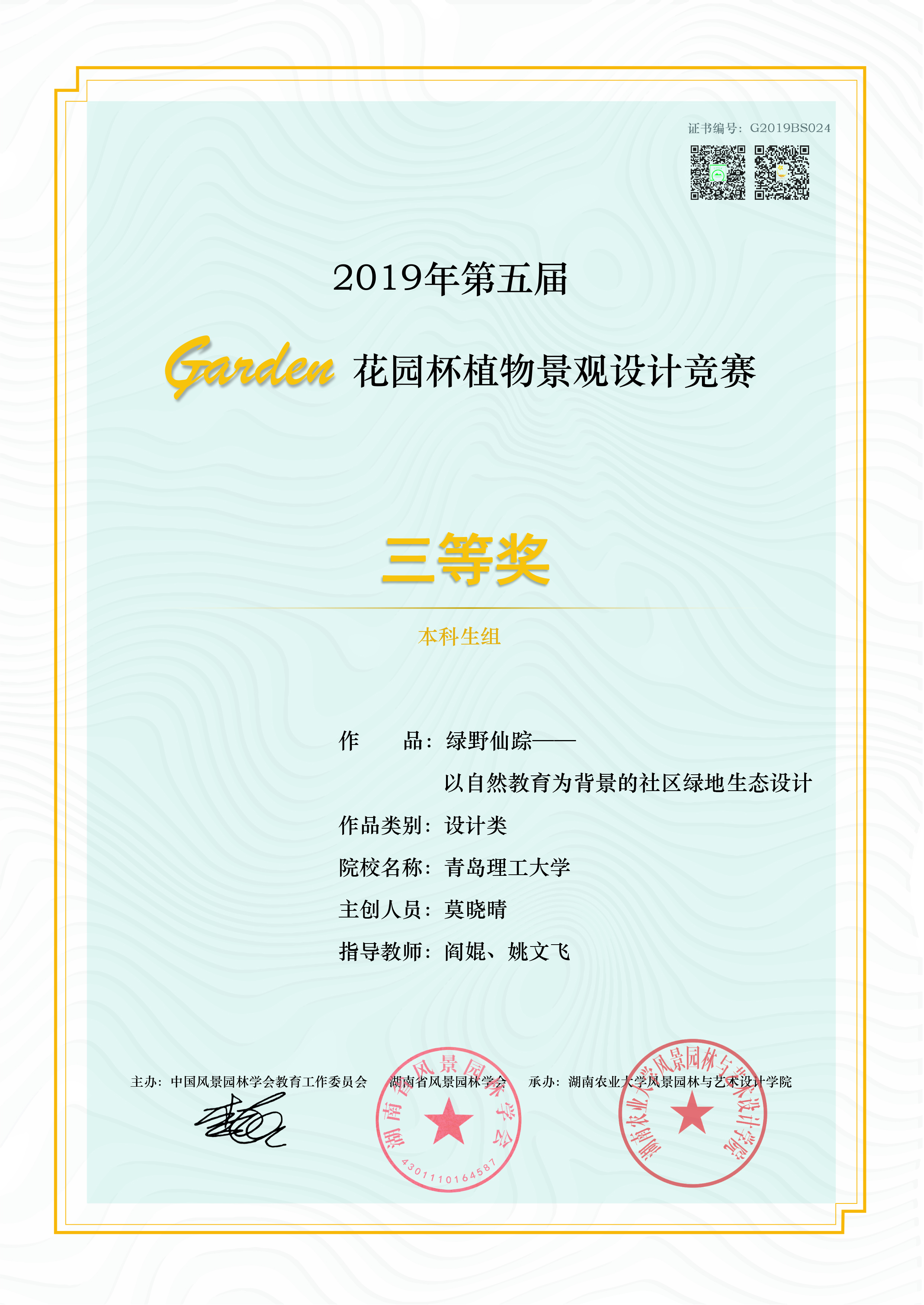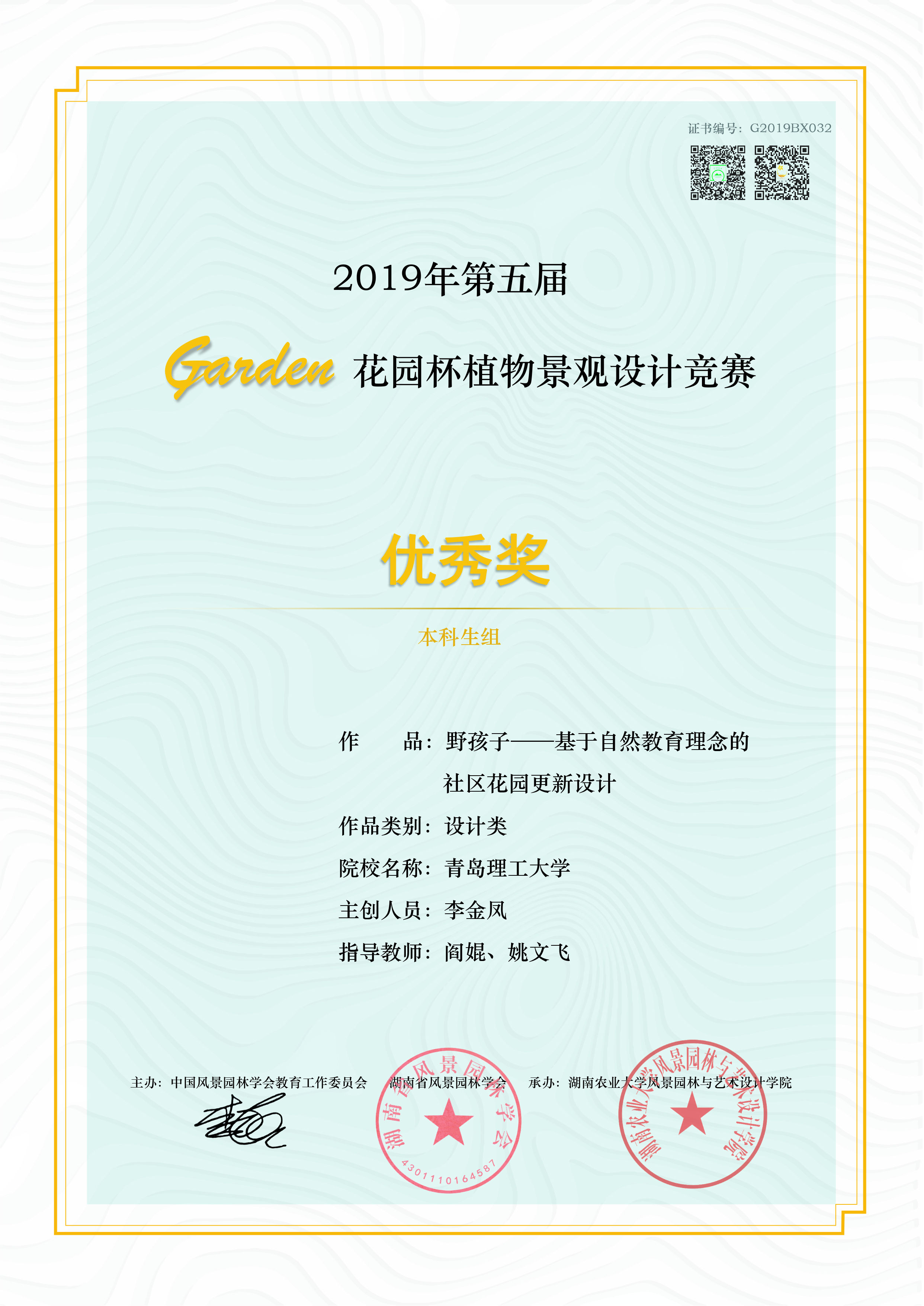 由朱蕊蕊老师指导,风景园林专业2017级本科生贺沁璇、刘钰靖完成的作品《像素定格-基于儿童乐园的老旧社区可持续发展更新》荣获二等奖。由朱蕊蕊老师指导,风景园林专业2017级本科生赵明婕、毛颜康、杨子茹完成的作品《滋源-青岛小村庄社区植物种植规划》;由朱蕊蕊老师指导,胡路瑶、汤茗程、廖麟杰完成的作品《未泯-自然教育社区公园》;由阎婫、姚文飞、王叁指导,风景园林专业2018级本科生莫晓晴完成的作品《绿野仙踪-以自然教育为背景的社区绿地生态设计》荣获三等奖。由朱蕊蕊老师指导,风景园林专业2017级本科生徐启明、胡业超、王亚菲完成的作品《光阴-基于儿童自然教育的社区花园设计》,吴思凡、李想、袁佳艺完成的作品《新生-情境化下的自然体验式教育》;由阎婫、姚文飞、王叁老师指导,风景园林专业2018级学生李金凤完成的作品《野孩子-基于自然教育理念的社区花园更新设计》荣获优秀奖。