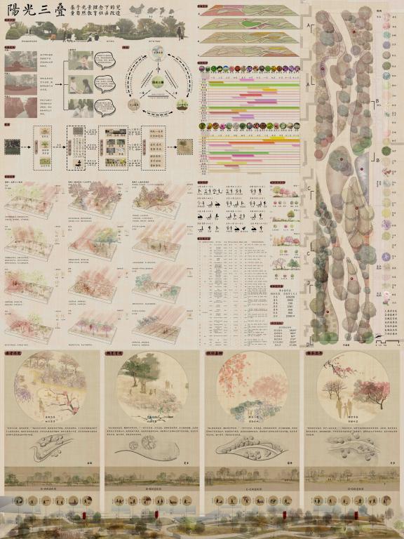 其中,由朱蕊蕊老师指导,风景园林专业2017级本科生钱文琪、阳桂芳、李淳提交的作品《阳光三叠-基于光影理念的儿童自然教育社区改 造》荣获一等奖。作品场地选址在山东省青岛市市北区某社区内,据现状调研分析,总结出基址缺乏的三个要素:自然光的缺乏、公共活动空间的缺乏,植物多样性的缺乏,同时存在居民需求得不到充分满足,缺乏互动空间、儿童活动空间等问题。针对以上问题,在对地设计中,提出“阳光三叠”的设计策略:一叠——十二时辰,打造十二时辰节点元素衬托光景变化;二叠——四季植景,通过春夏秋冬植物景观四大片区,突出四季光线变化与人在其间的互动;三叠——生长光景,在时间的宏观维度上层面,关注人与自然关系,通过设计,实现儿童自然教育、亲子感情培养、老人记忆重拾的和谐景象。