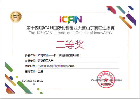 本次山东省物联网创造力大赛暨iCAN国际创新创业大赛山东赛区选拔赛由山东省科协、省委高校工委、团省委、省发改委、省经信委、省教育厅、省人社厅主办,山东省物联网协会、山东大学承办。大赛以“iCANiSTAR2020,物联智慧社会”为主题,划分创新制作类、创业实践类和iCAN+北斗生涯规划与拓展类三个组别,面向全省征集有关物联网、大数据、云计算、智慧农业、智能制造、人工智能等优秀项目作品,致力于推动物联网领域“大众创业,万众创新”,为促进我省经济结构调整、转型升级,实现更高水平发展,提供强有力的人才支撑。大赛通过网上注册报名并提交项目作品,评委线上对提交的项目展示视频、项目计划书以及PPT展示答辩进行评审评分。最终,我校土木工程学院“广博农业——新一代智能温室领导者”团队(队员:苏雨、陈卓、李梦娇、刘鹏超、徐成林,指导老师:王昊),“中昊智构——智能结构领航者”团队(队员:刘召超、刘海波、张嘉珺、邹湘哲、王梓亦,指导老师:王昊)凭借独特的项目创新和精彩的在线答辩表现,分获二等奖、三等奖。