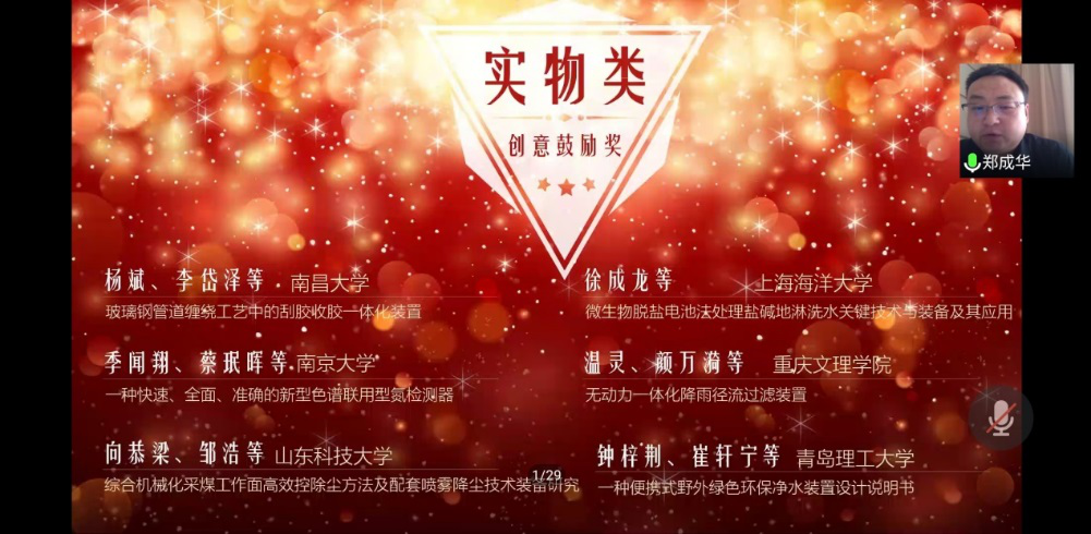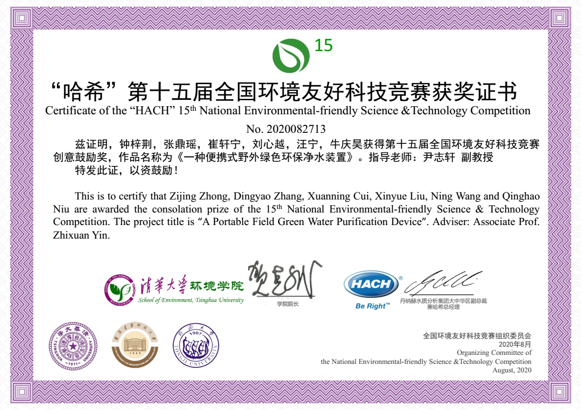 12月2日,第十五届全国环境友好科技竞赛颁奖典礼在线上举行。由环境与市政工程学院尹志轩老师指导,钟梓荆、张鼎瑶、崔轩宁等同学完成的作品《一种便携式野外绿色环保净水装置》在此次竞赛中获得实物类创意鼓励奖。
