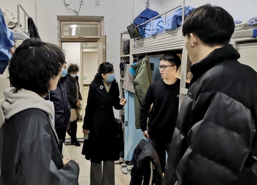 在北一公寓209宿舍,沈文青与宿舍成员亲切交谈,详细了解了期末备考情况、家庭情况,并勉励他们要珍惜、把握好大学时光,制定好每一年的小目标与人生道路的大规划,舍长带领宿舍成员之间团结一致向前看,共同努力共同进步;同时希望同学们多为学校的发展建言献策,与学校的发展同向而行,共同担起为党育人、为国育才的重任;最后沈文青也提醒同学们在离校前整理好六个人的“小家”,离校时切断宿舍电源,回家的路上注意安全、做好个人防护。