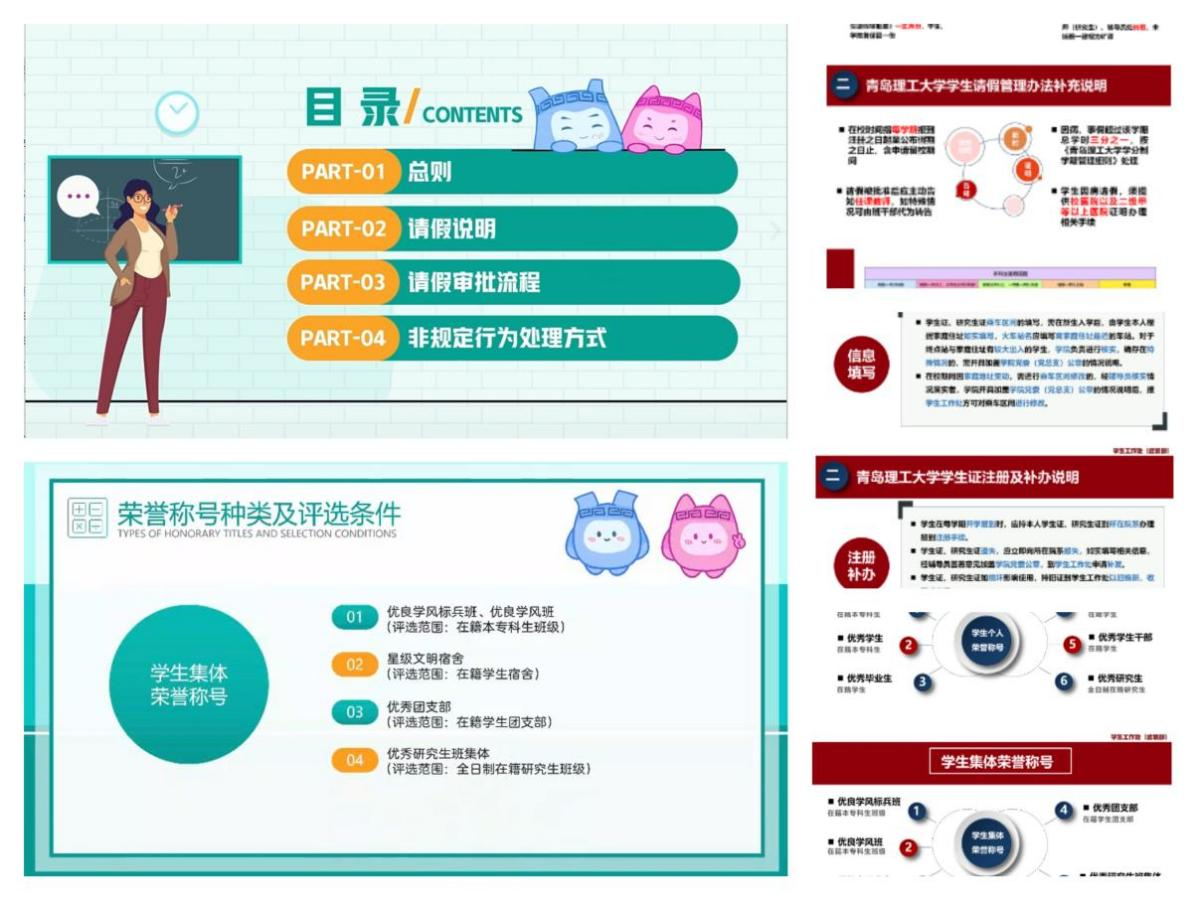 创新形式,在学深悟透上下功夫。前期,学生工作处制定并下发了《yl7703永利集团学生工作规章制度落实宣传工作方案》,制作了短视频、PPT、一图图解等形式多样的宣讲素材。组织召开副书记会,传达学校“规章制度宣传落实年”工作精神,明确学生工作制度学习的重要性,要求各学院结合方案,分层、分类开展辅导员、班主任、学生集中学习。学生处各科室就工作分工组织辅导员开展集中宣讲学习。