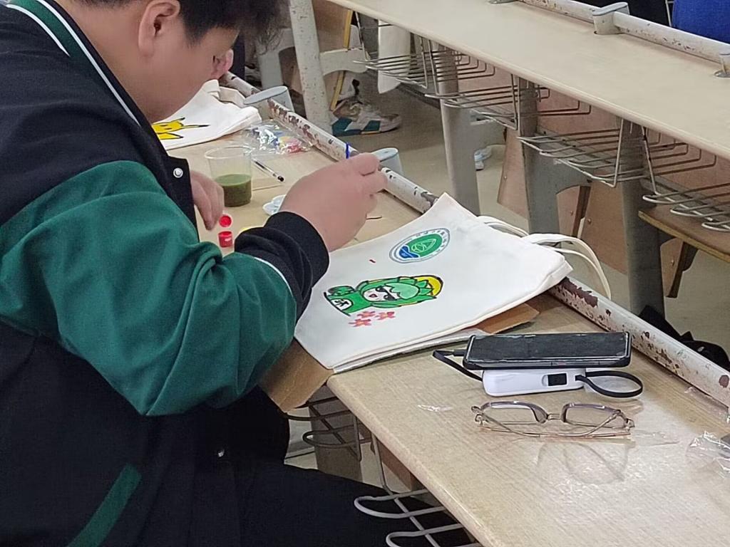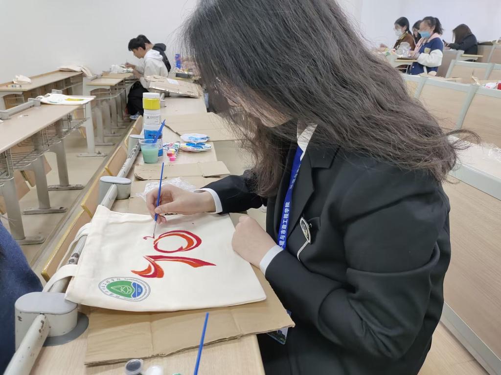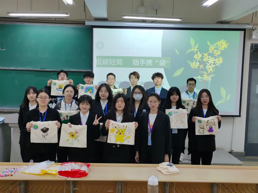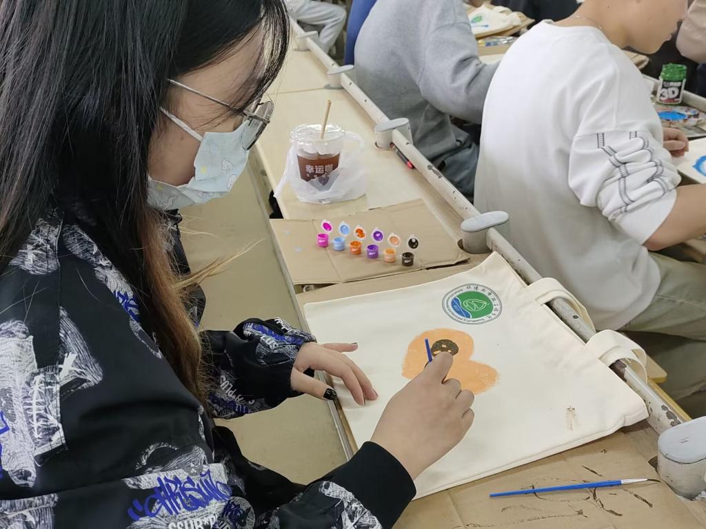 活动开始前,班级联络部的成员对在场同学进行环保知识宣讲,介绍环保的重要性以及使用环保袋的必要性。随后,同学们在环保布袋上用刷子勾勒出属于自己心中“碧水蓝天”的轮廓,再用画笔蘸取颜料精描细画,同学们精心的创作让每一份创意在环保布袋上得到具体表达。活动结束后,班级联络部将环保袋赠送给老师和同学,更好地宣传“世界地球日”,传递环保理念。