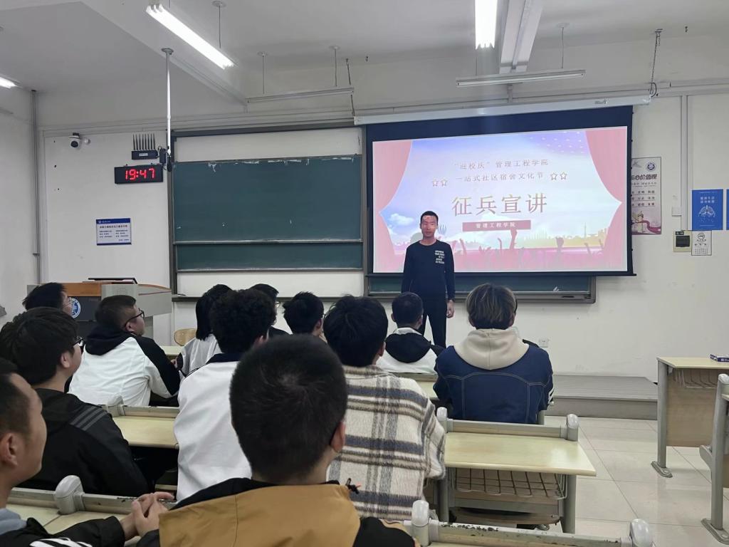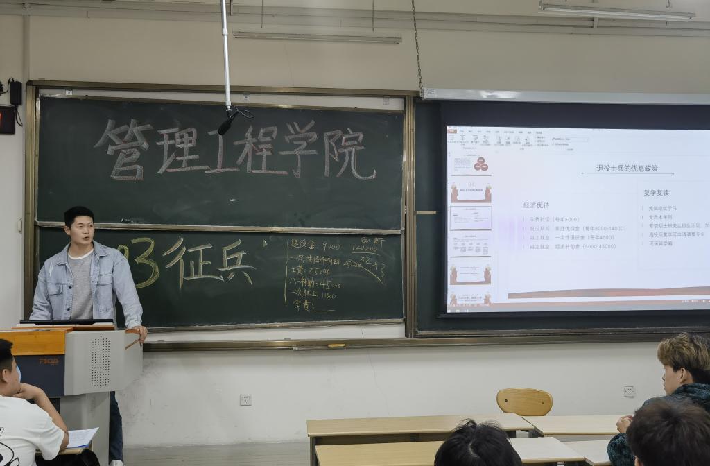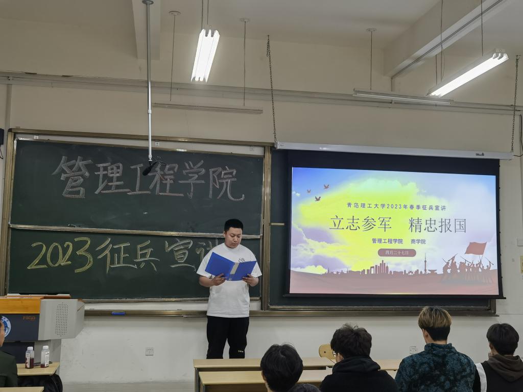 为加强学生爱国情感,使学生更加了解入伍生活,学院联合商学院开展征兵宣讲活动,学院退役军人、工程222班李华霖以“国富民强新时代,正是男儿当兵时”为主题,在我的军旅故事、当兵的好处、为什么要当兵、退役士兵的优惠政策四个方面展开了宣讲,同学们认真听讲、积极互动。商学院退役军人、会计194班赵振华以“参军尽义务,戍边卫国防”为主题开展宣讲,赵振华同学带领大家观看相关视频,使大家近距离感受了入伍生活,现场同学观后掌声雷动。管科226班陈杰表示,参军入伍是育人、育才、育魂战场,如能实现入伍梦想,定当不负青春、不负韶华。