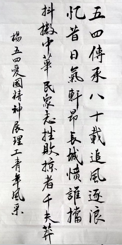 三行诗道我情怀,言语有尽意无穷。学院开展“三行诗抒怀之五四精神”活动,广大团员青年积极参加,挥斥方遒,展露文采,用所学辞藻表达对祖国的热爱、对建团百年的歌颂以及对五四精神的传承。“五四传承八十载,追风逐浪;忆昔日气轩昂,长城愤谁挡?抖擞中华民众志,挫败掠者千夫莽!”土木2212班戴佳诺短短几行诗表达出自己的感悟。辅导员殷宗华用毛笔进行书写,将丝丝情谊扣入字里行间,抒发时代之感。