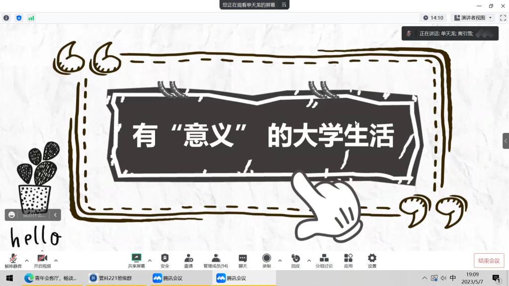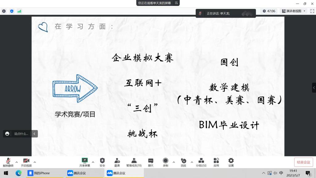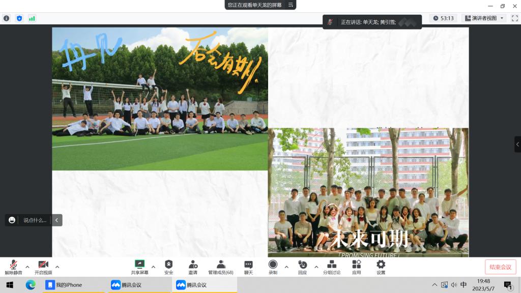 单天龙结合自身本科四年间的学习工作经历,从大学的意义、保研考研与就业的选择、学习与学生干部工作的平衡三个方面进行了经验分享。在大学生活意义方面,单天龙结合个人经历讲述了大学四年能够带给同学们的收获与成长,并建议同学们合理寻找榜样、明晰奋斗目标,让大学更加生活更加充实丰盈。在保研考研与就业方面,单天龙从考研的社会趋势、如何寻找研究方向以及如何备战考研或保研等方面进行了详细的分享,带领同学们对未来学业发展方向进行更深一步的了解与认知,并结合身边的案例向大家展示了就业路径的益处。在学习与学生工作的平衡方面,单天龙通过照片展示的形式向同学们分享了自己在本科期间参与的部分竞赛成果及担任的学生干部工作成果,鼓励大家把握机会,不断积累经验。王俞苹鼓励同学们大学期间要坚持不懈,先苦后甜,从小事做起,充分把握大学时光,稳扎稳打收获充实有意义的大学生活。