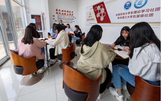 “作为大学生理论学习社团,学习习近平新时代中国特色社会主义思想是我们社团工作重点,我们要在学院学生中带头读书、带头学习,把理论知识应用于实践,把习近平新时代中国特色社会主义思想转化为我们的思想伟力、实践动力。”商学院习近平新时代中国特色社会主义思想研究会社团团长,商学院研究生朱亚萌在社团活动室,带领社团成员共读《习近平著作选读》,畅谈学习心得体会。而全国百佳大学生理论学习社团商学院扬帆社则在社团活动室开展习近平新时代中国特色社会主义思想理论学习研讨,社团成员踊跃发言,发表学习感悟,书写学习心得体会,在理论共学中碰撞“思想火花”,厚植“成长底色”。