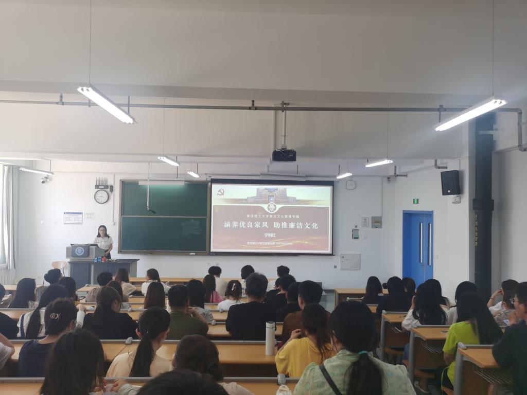 为进一步落实上级党委关于加强新时代廉洁文化建设的措施要求,教育引导大学生养成诚心做事、诚实做人的良好道德习惯,引导大学生增强纪律、法律意识,扣好廉洁从业“第一粒扣子”,上好毕业前的“最后一课”,6月8日,管理工程学院于02-402教室开展毕业生“青廉课堂”主题教育活动,本次活动邀请到学校工会副主席宁利红主讲,学院本、研毕业生代表参加,活动由辅导员李佳妮主持。