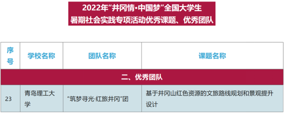 6月16日,由团中央青年发展部、全国青少年井冈山革命传统教育基地管理中心于2022年暑期组织开展的“井冈情·中国梦”全国大学生暑期社会实践专项活动实践成果评选圆满结束。由校团委指导,建筑与城乡规划学院学院教授于红霞,学院团委书记杨霈宣,辅导员朱华建带队的“筑梦寻光·红旅井冈”团队获共青团中央“井冈情·中国梦”全国大学生暑期社会实践活动优秀团队称号。