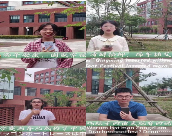 协会邀请来自不同学院的外语爱好者,分别用中文、英语、德语、韩语以及日语五种语言录制视频讲述端午民俗传统。英语201班董岳阳用德语讲述到端午节吃粽子的习俗已有几千年的历史,寄托了对屈原的思念之情 。“粽子香,香厨房。艾叶香,香满堂。桃枝插在大门上,出门一望麦儿黄。”土木203的王克飞用流利的日语讲述了赛龙舟这一习俗的起源,财管221孙雅婧则用英语向我们分享了端午饮蒲酒的习俗起源以及雄黄酒在杀菌消虫的小妙用。