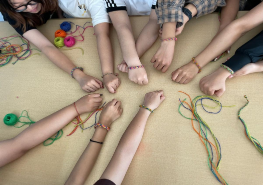 在编织过程中,学生们针对各自不同的喜好,选择了不同的丝线颜色组合,编制出的每一条五彩绳都独具特色,体现出他们个性化的设计理念和创造性思维。有些同学选用了传统的红、黄、蓝、绿等颜色,运用不同的编织方法,也有些同学选择用串珠等多样的材料,巧妙地编入手环,让五彩绳的造型和质感更加丰富。编制过程中有快有慢,但是每一名同学都全身心投入到编织的喜庆氛围中。制作完之后,参与同学之间互换五彩绳,并交换了彼此的祝福。