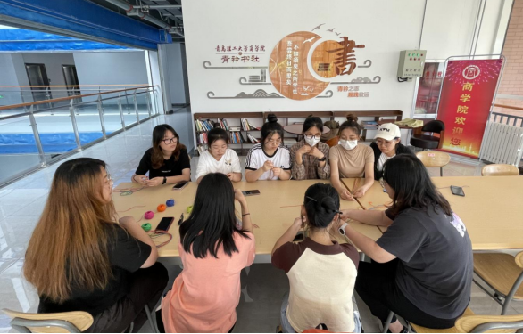 端午节系五彩绳,是古老汉族传统习俗。五彩线是端午节吉祥物兼饰品,有祈福纳吉的美好寓意。活动伊始,学生拿出提前准备好的编织五彩绳所需材料,在魏倩倩的带领下,了解和研究编织五彩绳的基本知识和方法,并掌握打结和编织技巧。