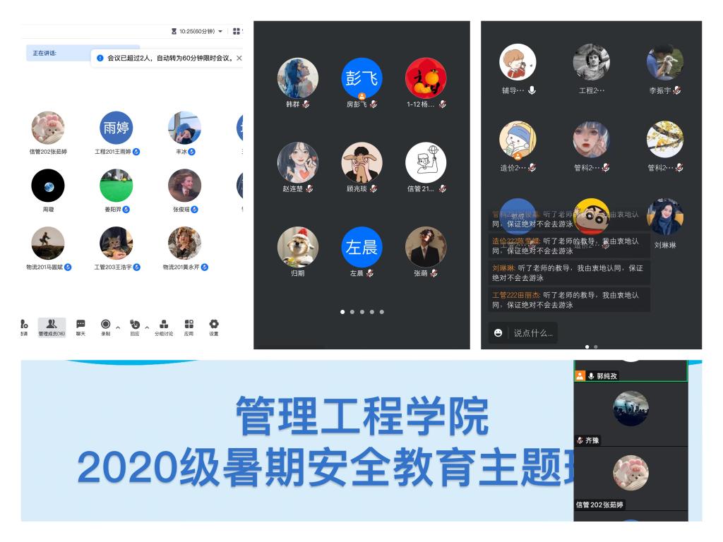 学院根据暑期特点,在全院范围内有效开展线上宣传教育工作。线上班会以警示为重点,通过案例分析、在线讨论等多种方式,向学生科普预防人身及财产安全受损的方法及安全事故发生后的正确应对措施,真正做到安全教育入耳、入心、入脑,确保不遗漏一名学生、一个家庭,切实提升学生安全防范意识和自我约束能力。