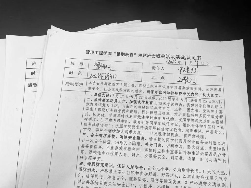 学期末,全院学院3个年级共计42个班级开展“暑期安全教育”班会。班会上,各班班主任进行了避险防灾及反诈防骗教育,首先强调离校时应做好安全检查,消除安全隐患;其次例举了暑期出行会遇到的人身安全问题,强调遇到各类人身安全受损情况后的应对措施;最后,班主任们科普了电信诈骗的危害和主要手段,告知同学们应当树立安全意识,养成良好的信息活动习惯。会后,全院1500余名学生在“暑期安全教育”实施认可书上慎重签名,承诺提高安全防范意识。