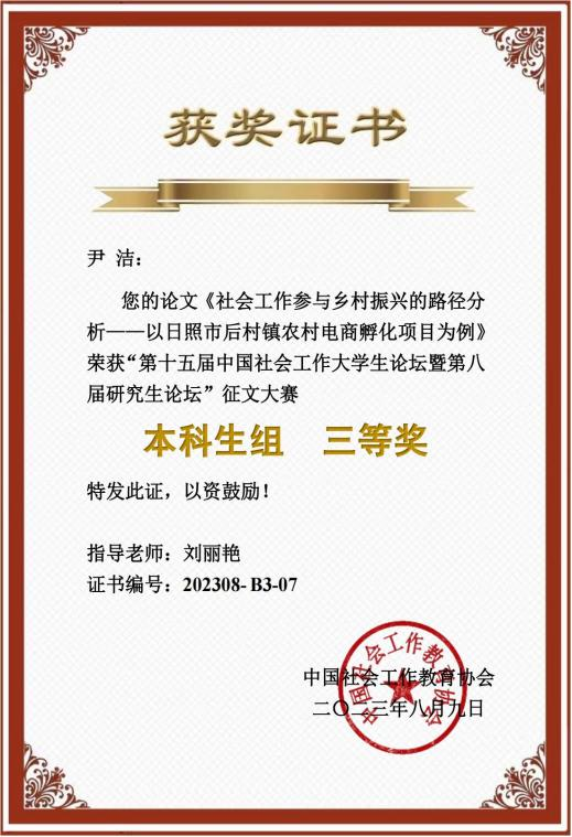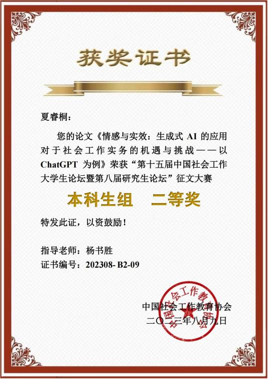在本次论坛中,我校社会工作专业的学生充分发挥专业优势,展现学子风采。夏睿桐同学的论文《情感与实效:生成式AI的应用对于社会工作实务的机遇与挑战——以ChatGPT为例》(指导教师:杨书胜)荣获了本科生组二等奖。尹洁同学的论文《会工作参与乡村振兴的路径分析——以日照市后村镇农村电商孵化项目为例》(指导教师:刘丽艳)荣获了本科生组三等奖。研究生韩泽坤、潘洁发表的论文也获得了评委的高度肯定。