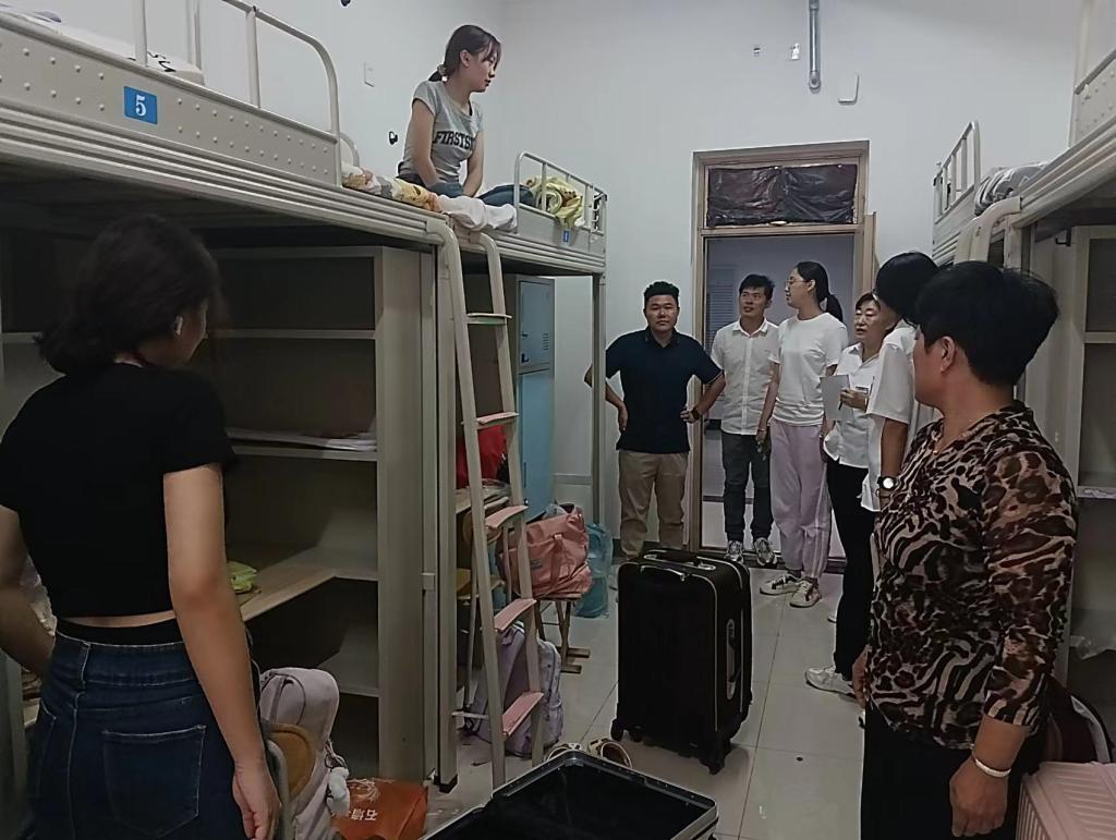 新生完成报道后,开始到宿舍整理床铺,学院副书记王中帅带领辅导员前往新生宿舍了解学生所想,解决学生所需。“老师,我的箱子放不下了,这怎么办?”“老师,校园网怎么用不了……”面对新生初入校出现的问题,老师们亲身行动,帮助新生合理摆放行李箱,插空调电源,调试校园网……“刚入校还是有一些不适应,老师们到宿舍来帮助我们解决问题,我感觉到很暖心,我也会及时调整好离家的情绪,尽快融入到多彩的大学生活中。”新生刘同学说道。