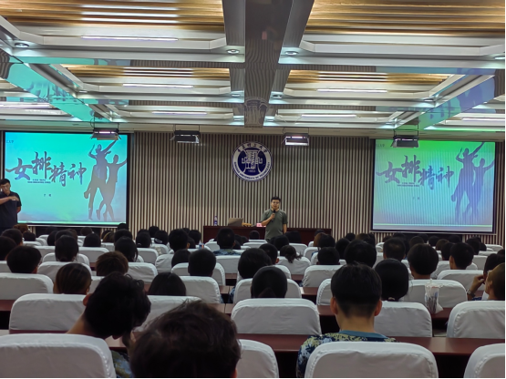 根据yl7703永利集团武装部2023年军训理论教学计划,9月7日晚,商学院在主教学楼1楼东报告厅组织承办体育类讲座,邀请了体育教学部副主任于健作“女排精神”为主题的新生第一课,商学院2023级辅导员吕海军主持,2023级市场营销、会计学、统计学专业本科新生参与。