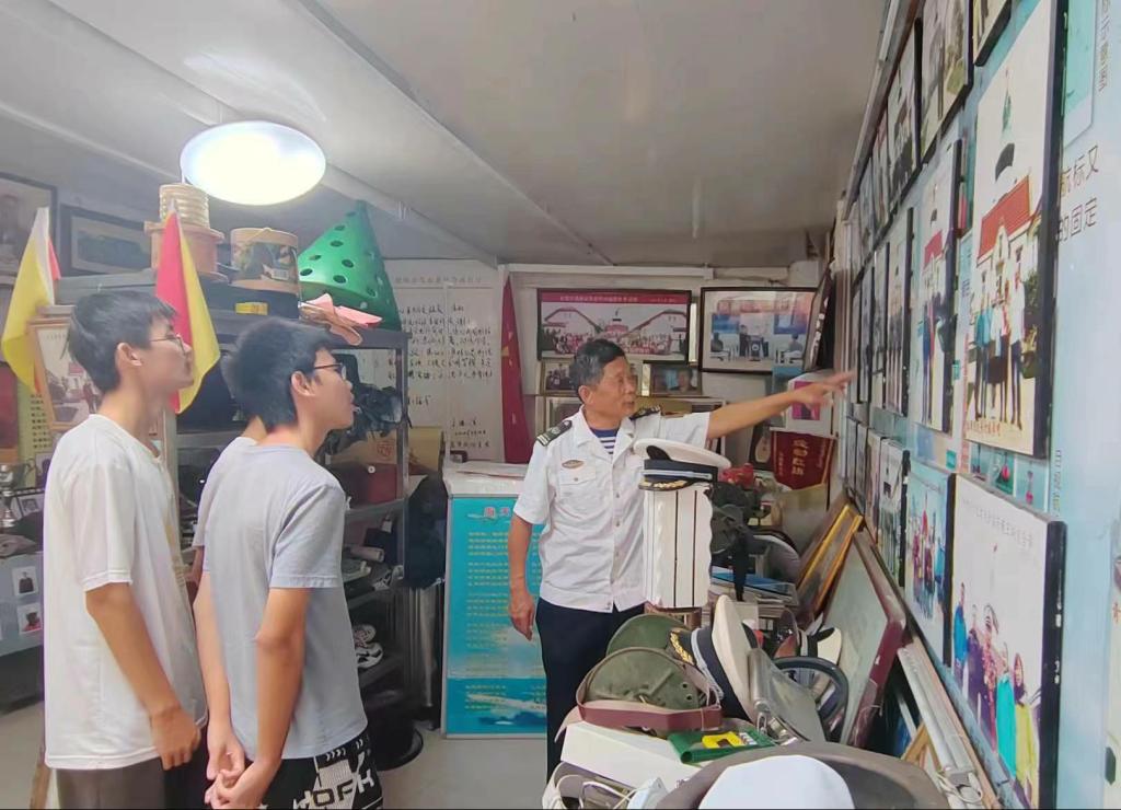 王炳交对同学们的到来表示热烈欢迎,带领同学们参观了灯塔历史陈列室,如数家珍地讲述着一件件陈列品背后的历史故事,耐心细致地介绍了团岛灯塔的历史变迁、工作原理和养护知识。在王炳交的带领下,学生们登上了百年灯塔,近距离切实感受百年灯塔的独特魅力和王炳交四十年如一日的坚守。在与王炳交的交流和沟通中,他说道:“国庆74周年到来,我们不仅庆祝国家的繁荣昌盛,也激发每个人的爱国情怀。我们要保持昂扬的态度,坚持不懈,为国家富强民族振兴伟大事业争做贡献。”