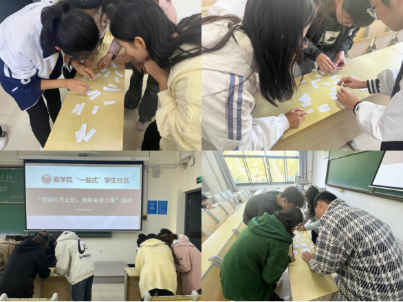 为深入贯彻落实党的二十大报告精神,进一步推进“一站式”学生社区建设,充分发挥社区党建指导站、党团服务站的作用,商学院于10月21日在主教学楼B210教室举办“拼起红色记忆,汲取奋进力量”主题活动。商学院党员学生及其他各年级同学参与本次活动。