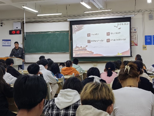 活动伊始,陈忠良同学结合自身的实际入伍经历,详细解读了应征入伍的相关政策、流程等,并分享了自己在不同阶段的心理变化。他特别强调,“青年时期是一个人人生旅程中的重要阶段,在这个阶段年轻人通过投身军旅生涯,可以获得许多宝贵的经验和成长机会,为个人成长和社会发展做出积极贡献”。这使得同学们对于入伍的流程和规章制度有了更为深入的了解。随后,孙可同学以“我的青春军旅”为主题,分享了自己作为边防战士的军旅经历,深入阐述了国防建设的重要性。他呼吁同学们要牢记历史,居安思危,把个人成长与国家命运紧密联系在一起。这引起了同学们的广泛共鸣。最后,徐英杰同学以“我参军,我光荣”为主题,讲述了自己从参军到退役复学的成长变化,并结合自身的参军经历向同学们着重阐述了“国家安全是每个人的责任,每个人都应该关注国家安全,积极参与到维护国家安全的工作中来”。这进一步激发了同学们的爱国热情。