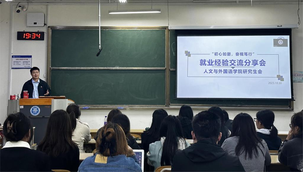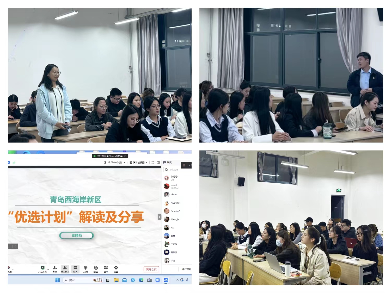 10月30日,人文与外国语学院在主教学楼B105教室举办优秀校友就业分享会。分享会采用线上+线下相结合的方式,邀请了优秀研究生校友2021届毕业生李杨和2022届张皓祯就“青选计划”、西海岸新区“优选计划”等内容进行就业经验分享。学院团委书记徐卫晓、辅导员王才升以及300余名学生参加。