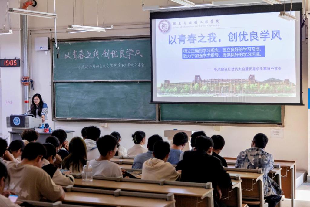 为进一步加强学院学风建设,激发广大学子积极进取、不断开拓、勤奋学习、砥砺成才的自觉性和积极性,促进和推动2023级新生优良学风的形成,11月2日下午,信息与控制工程学院在主教学楼B335教室举办了主题为“以青春之我,创优良学风”的学风建设月启动仪式暨优秀学生分享会。会议由辅导员贾戈主持,2023级信息通信全体学生参会。