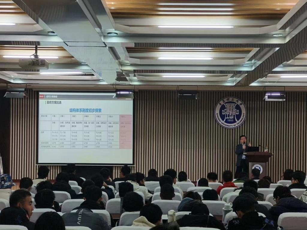 刘宜丰总工讲到,从业以来参与了200余项工程结构设计并主持了成都天府国际机场等数十项标志性公共建筑结构设计,他还结合自己在建筑设计领域的丰富经验和深厚的理论基础,分享了深圳福田金融科技大厦的设计案例和研究成果。他介绍了如何通过立面转折柱来解决超高层建筑的结构问题,并详细解释了这一设计的优势和应用前景。他用通俗易懂的语言向学生们讲解了建筑设计中的一些关键概念和技术要点,不仅提供了实用的设计思路,还激发了学生们对建筑设计的兴趣和热情。