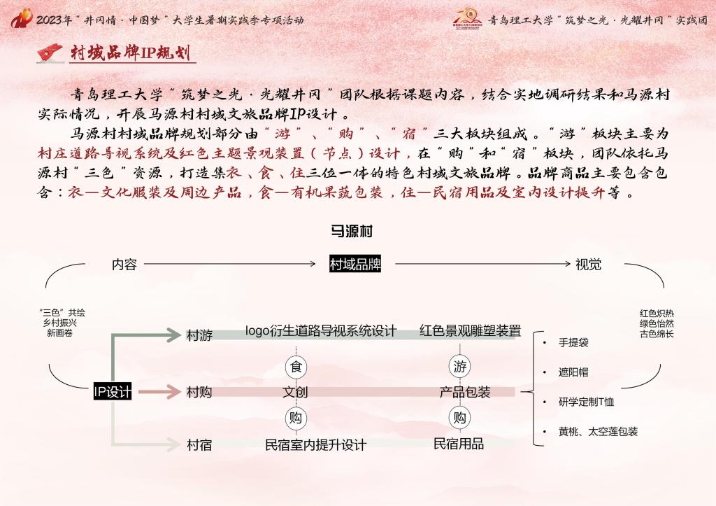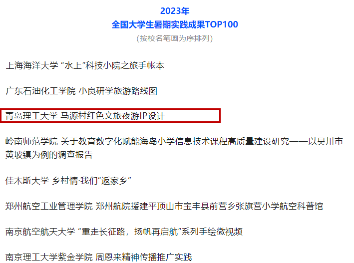 近日,中国青年报举办的“2023年第九届全国大学生暑期实践展示活动”获奖名单公布。建筑与城乡规划学院于红霞教授指导,张宇老师带队的“筑梦之光•光耀井冈”团队实践成果——《文旅夜游IP设计助推革命老区红色资源挖掘及转化利用研究——马源村红色文旅夜游IP设计》荣获全国大学生暑期实践成果TOP100。
