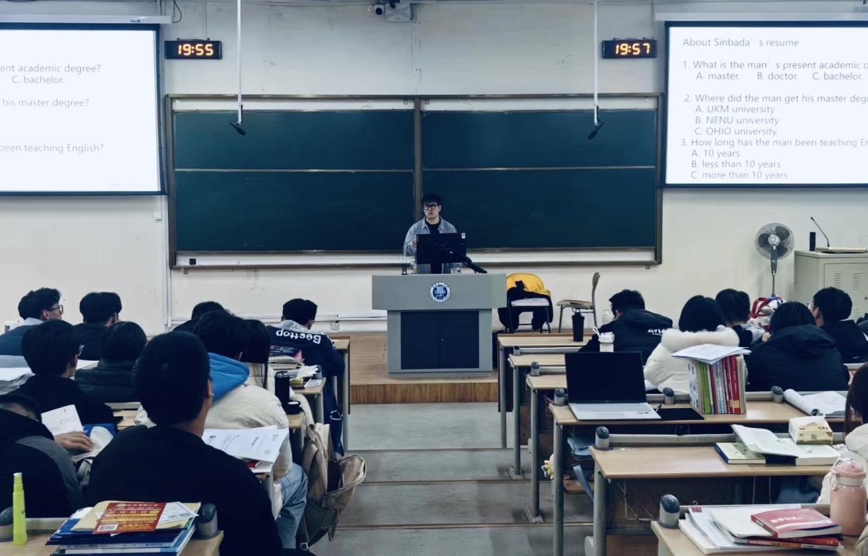 刘鹏首先用英文进行简短凝练的自我介绍,将英语学习的注意事项蕴于其中,引出讲座的重点——读音问题。他从单词发音入手,对比了英式美式发音的区别,强调了听力语段中应该注意的连接词,采用让学生跟读的方式,讲解了“爆破”、“击穿”、“失爆”等发音方式的技巧。随后,他从听力、长篇阅读、仔细阅读三方面向学生进行讲解,分析了各题型的赋分规则。针对学生最关注的听力技巧部分,刘鹏以“视听一致”的解题策略为中心,辅以历年真题进行解释,便于学生理解。刘鹏强调,要练好听力,首先要提高单词量的储备,建议大家以滚雪球式进行复习记忆,多听BBC和VOA慢速英语,并且做到跟读和模仿,长期练习来提高听力能力。最后,针对同学们在英语学习中存在的疑惑,刘鹏进行了一一解答。