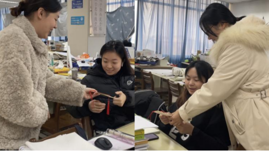 祝福信笺,温情护航。毕业生辅导员张铎、郑润琪走进考研自习室,为同学们送上学院专属祝福书签,鼓励他们在最后的时刻保持好心态,抓住机会、迎难而上,希望考研的同学们都能像书签上写的那样,经过厚积薄发的沉淀,最终能在考场上有信手拈来的从容。“在紧张焦虑的学习之余收到了老师们送来的温暖,这份牵挂让我非常感动,坚定了我加油冲刺、考出好成绩的信心!” 建学193班张广源同学说。