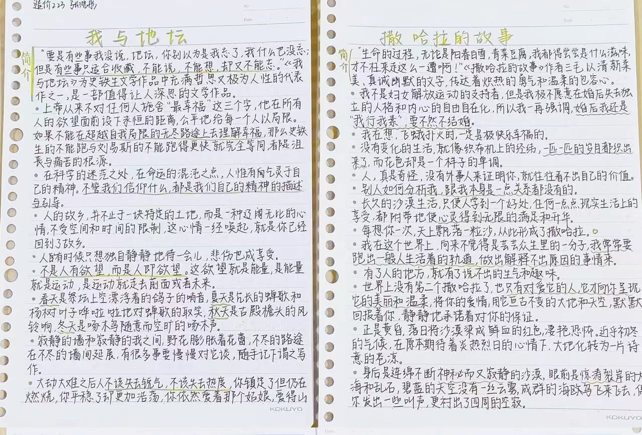 “书海泛舟,笔下生辉”读书笔记大赛分为初选和终选两个环节,本次比赛要求作品中体现对书籍内容的理解和感悟,以及个人的思考和见解,读书笔记要展现设计思想,富有美感,吸引眼球。活动中参赛同学向大家展示了《瓦尔登湖》《我与地坛》《觉醒年代》《活着》《堕落》《城南旧事》《第七天》《围城》《文化苦旅》《钢铁是怎样炼成的》《一片叶子下的生活》等优秀文学作品的读书笔记,用极富感染力的语言,从作品内容,作者简介,精彩语段,读后感悟等方面对名著进行了深入解读,记录感悟,表达了自己的见解。本次参赛选手刘瀚森同学分享到:“此次‘书海泛舟,笔下生辉’读书笔记大赛活动为我们提供了一个深度阅读、提升文学素养的机会,我们在比赛中共同交流优秀文学作品,互换思想,共同进步,增近了彼此之间的了解,体验到了阅读的快乐与幸福。”