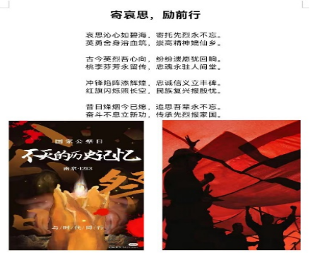 商学院团委组织各团支部开展“缅怀革命先烈,深怀感恩前行”主题团日活动,同学们或抄写国家公祭鼎铭文示哀思,将万千思绪汇于纸上;或通过诗词创作的形式,执笔写下对先烈的缅怀之情,用诗词寄托敬意;或通过观看影片的形式,感受历史的惨痛。团日活动中,学生们用最真挚的情感,写下三行祭文:“千万烈士亡疆场,爱国衷肠不可忘,亿万同胞祭国殇。”展现了商院学子缅怀遇难同胞、铭记民族历史的坚定信念。