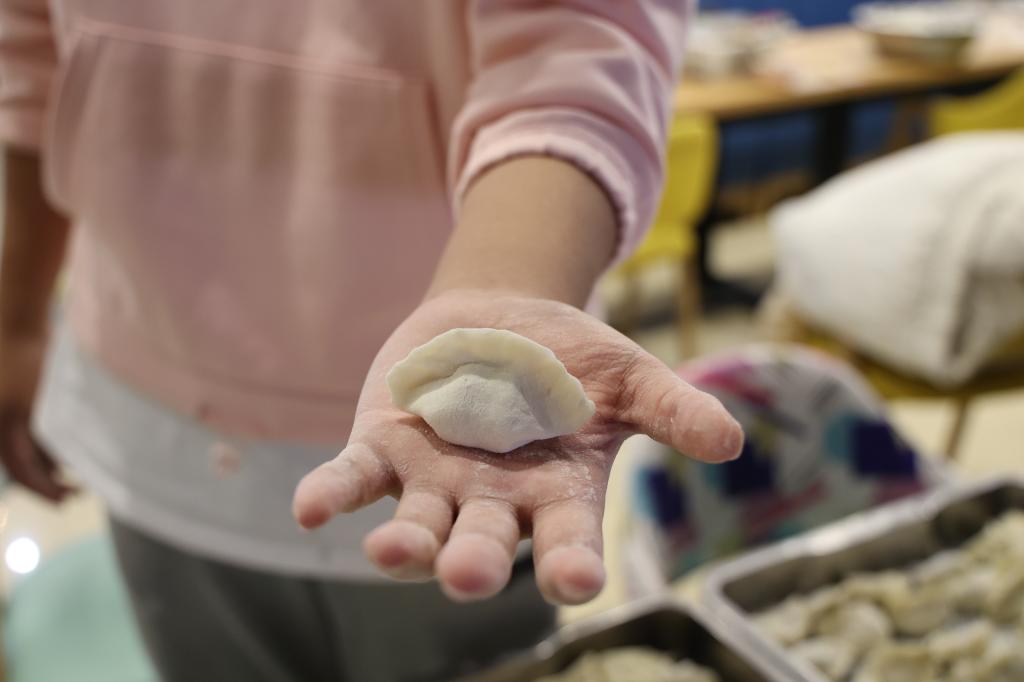 祥园餐厅的工作人员提前准备好了饺子皮,调好了饺子馅并备好了托盘等物料。师生们齐聚食堂一起包饺子,大家热情高涨,相互传授包饺子经验,忙得不亦乐乎。不一会儿,在欢声笑语中,在十指翻飞间,一只只精巧的饺子便诞生了,有的大有的小,有的圆有的扁,有的像小月牙,有的像金元宝,有的像小馄饨,有的像小笼包。学院党委书记马莉也手把手地教同学们如何擀皮,怎样包成一只圆鼓鼓的饺子。