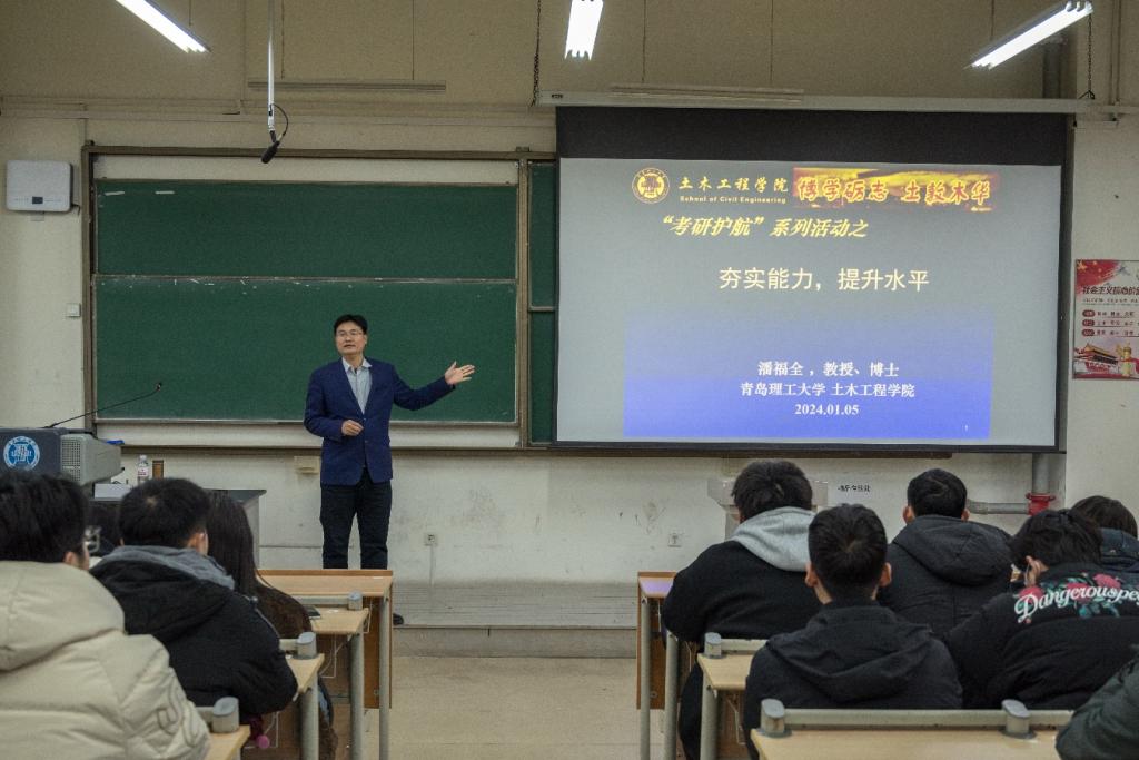 为进一步加强学风建设,营造良好学习氛围,帮助考研学子全面准确了解考研事项,1月5日,土木工程学院在黄岛校区主教学楼B301教室举办“夯实能力,提升水平”考研护航讲座。讲座由学院副院长潘福全教授主讲,学院2021级学生参加。