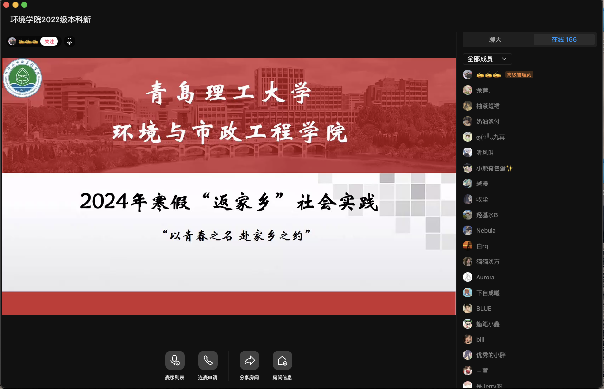 首先,各年级辅导员对寒假社会实践进行简要介绍,实践主题涵盖“青鸟计划”、理论普及宣讲、助力乡村振兴、弘扬传统文化、“大学生社区实践计划”等多个方面。另外,鼓励学生结合专业特点,关注碳达峰、碳中和、黄河流域生态保护和高质量发展等国家战略,发挥环境学科特长,将所学知识投入到社会实践中。