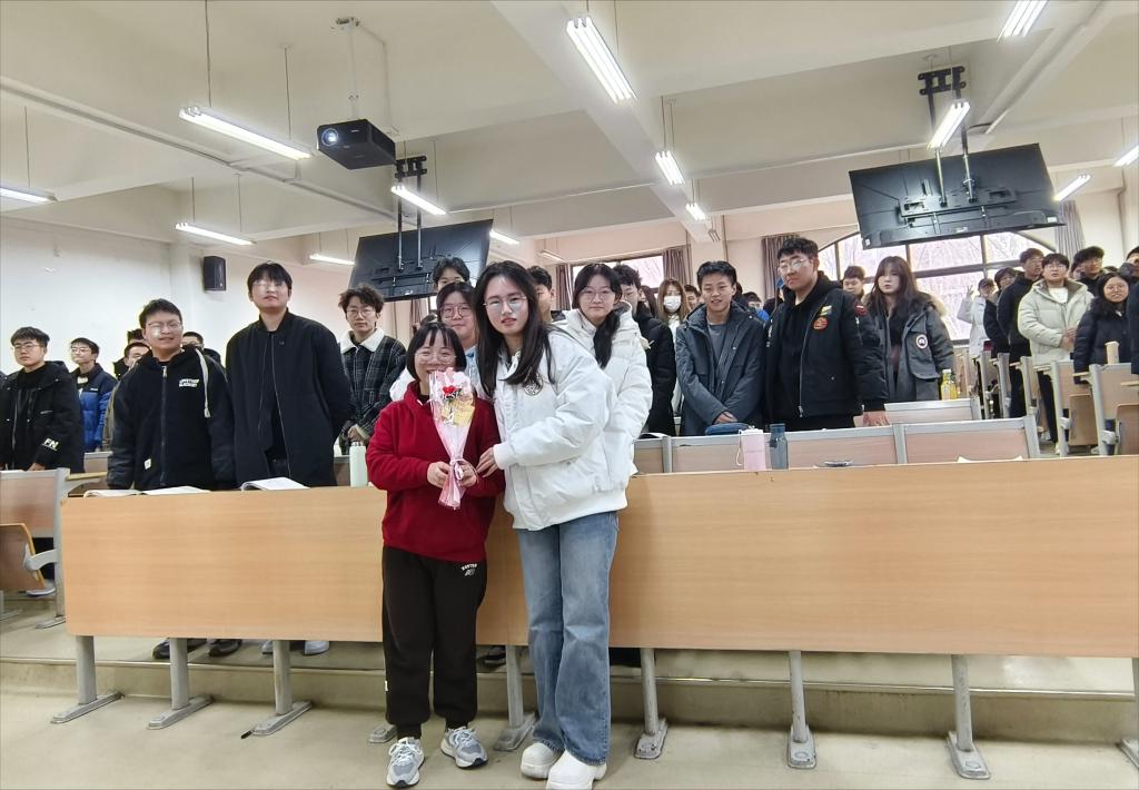 网安223于佳玮在上课之际向算法设计与分析课教师刘秀燕老师送上了一支小红花,班级同学纷纷起立,表达着深深的敬意和祝福。刘老师向同学们说道,“作为一名女性教育者,能够得到学生们如此深情的祝福,我感到非常幸福和荣幸。教育是一种传承,而今天,同学们用这样美好的方式传递了爱与尊重,让我深受触动,谢谢大家!”之后学院生活权益部的同学们,将其他小红花送到了公寓阿姨、食堂阿姨、保洁阿姨的手中,阿姨们收到花纷纷露出了开心的笑容。