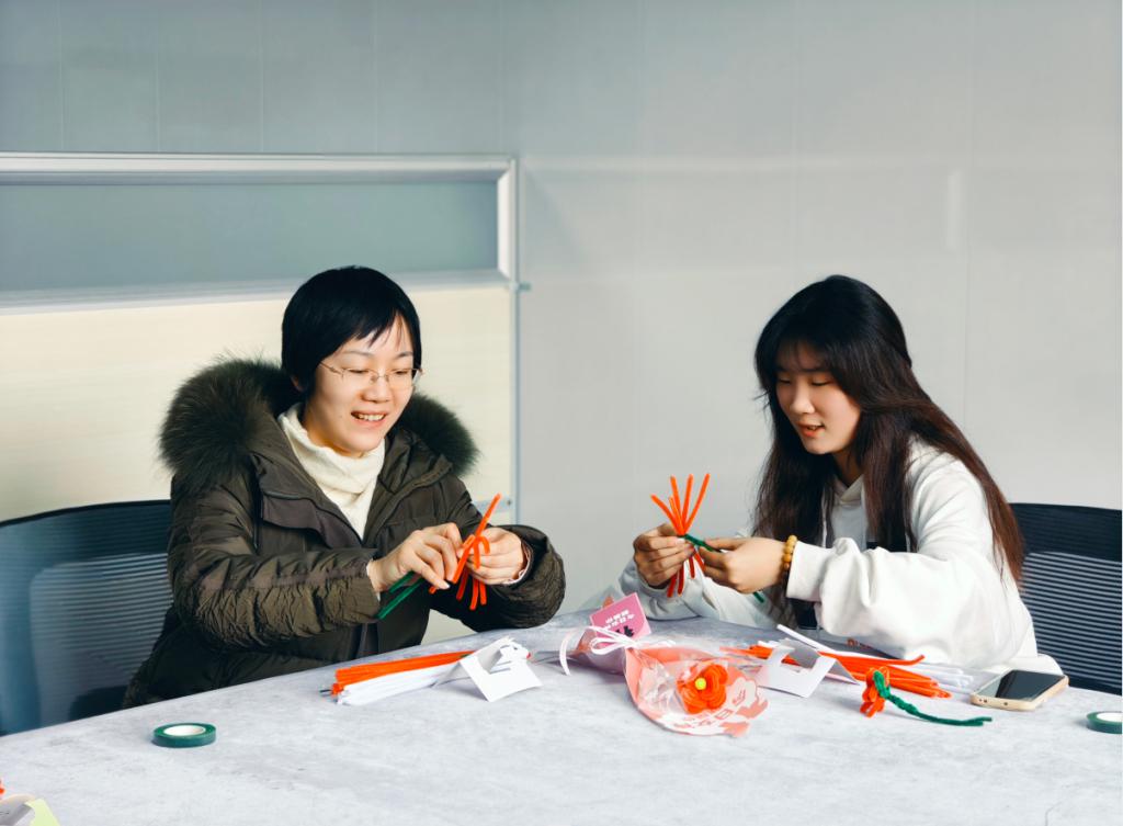 3月6日下午,信息与控制工程学院学院分工会在信控楼207举办“送你一朵小红花”手工制作DIY小红花活动,邀请学院党委书记高洁、女教职工代表、学生志愿者共同制作“小红花”。学生志愿者先详细地给大家演示了一遍花朵的制作过程,从花瓣如何捏起开始,到叶子如何卷,再到把它们用绿色胶带缠到一起,就做成了一朵可爱的小花朵。一条条鲜艳的扭扭棒在大家灵巧的双手下变成了一朵朵娇艳的玫瑰花。自动化教研室王瑞华老师说:“没想到自己居然可以做出来这么好看的玫瑰,太有意义了。”